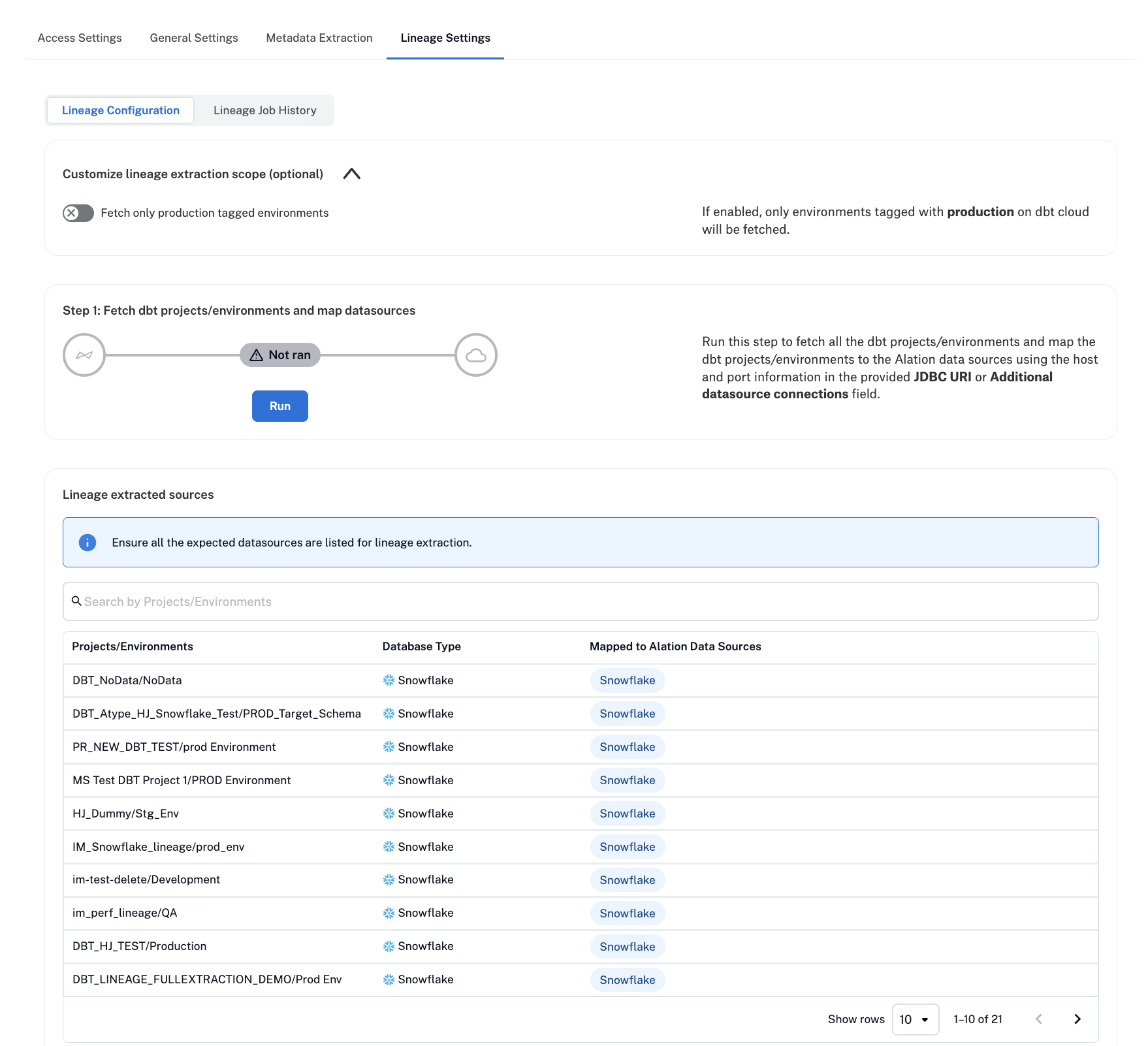 When this toggle is enabled, the connector fetches only dbt Cloud environments with a production tag and extracts lineage only for these environments.